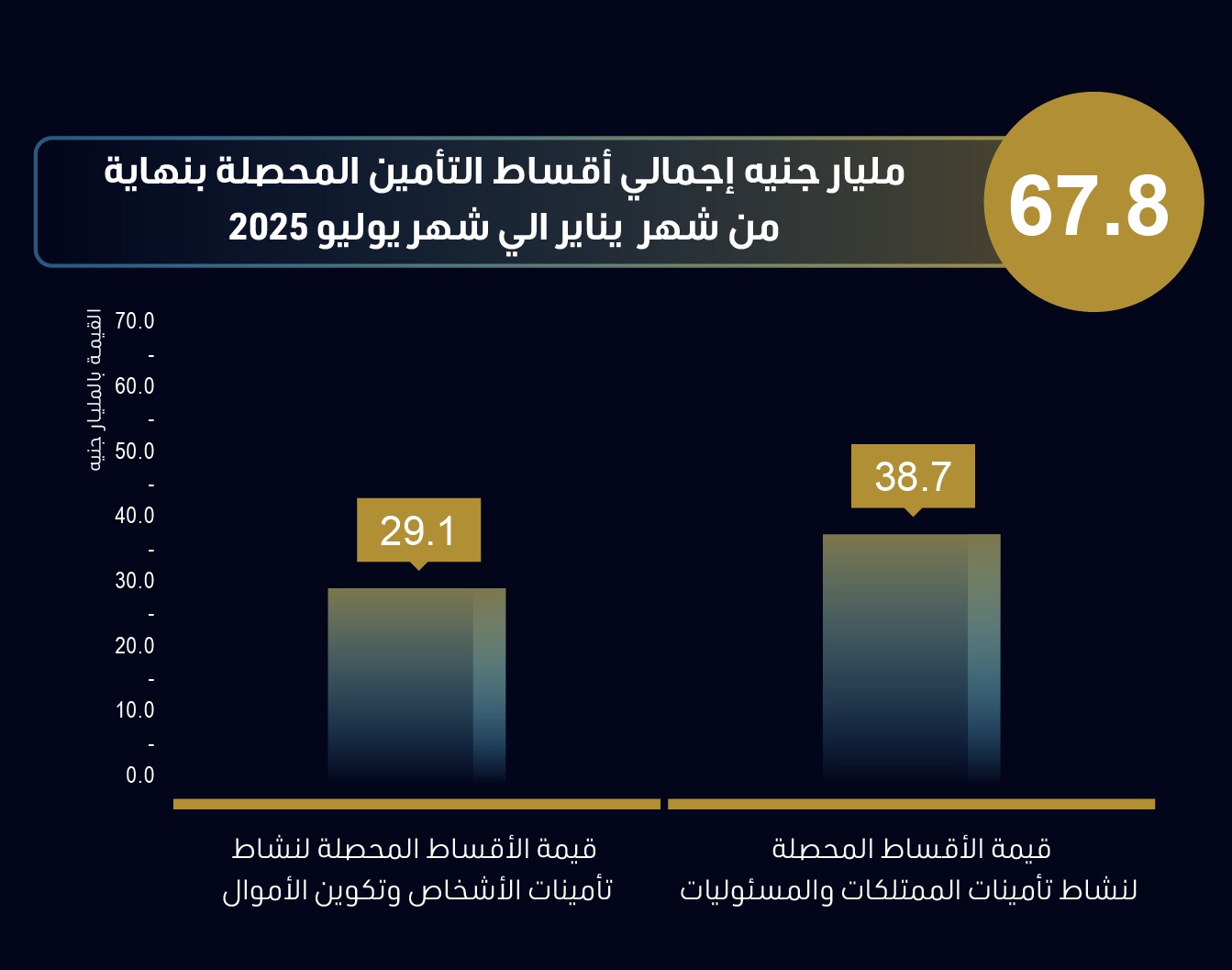 سجلت إجمالي أقساط التأمين المحصلة بنهاية يوليو 2025 نحو 67.8 مليار جنيه، موزعة على: