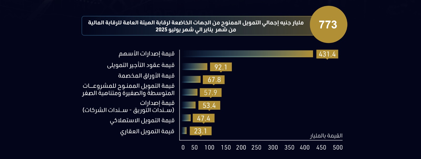 أظهرت أحدث التقارير الصادرة عن الهيئة العامة للرقابة المالية أن إجمالي التمويل الممنوح من خلال الجهات الخاضعة لرقابة الهيئة (أنشطة سوق رأس المال والتمويل غير المصرفي) بلغ 773 مليار جنيه خلال الفترة من يناير وحتى نهاية يوليو 2025.