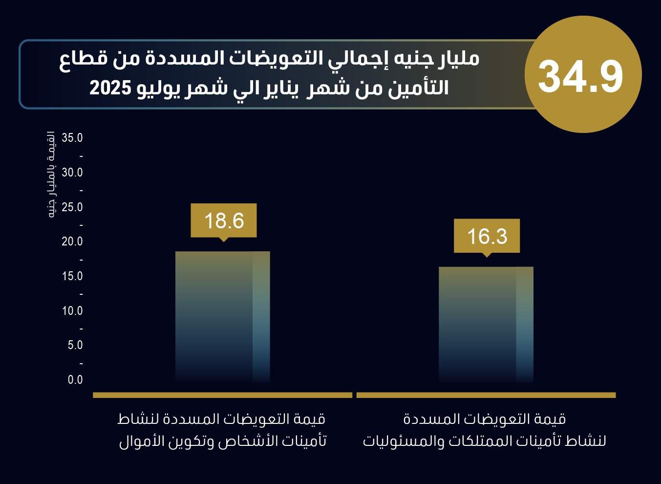 بينما بلغت إجمالي التعويضات المسددة من قطاع التأمين نحو 34.9 مليار جنيه، توزعت كالتالي: