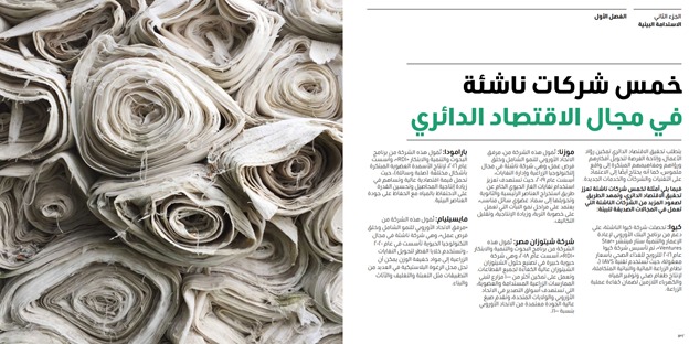 ويذكر التقرير السنوي لوزارة التعاون الدولي، نماذج للشركات الناشئة، التي حصلت على دعم وتمويل من خلال الشراكات الدولية، في مجال الاقتصاد الدائري، لتعزيز التحول نحو الاقتصاد الأخضر، بما يمهد الطريق لصعود المزيد من الشركات الناشئة التي تعمل في المجالات الصديقة للبيئة.