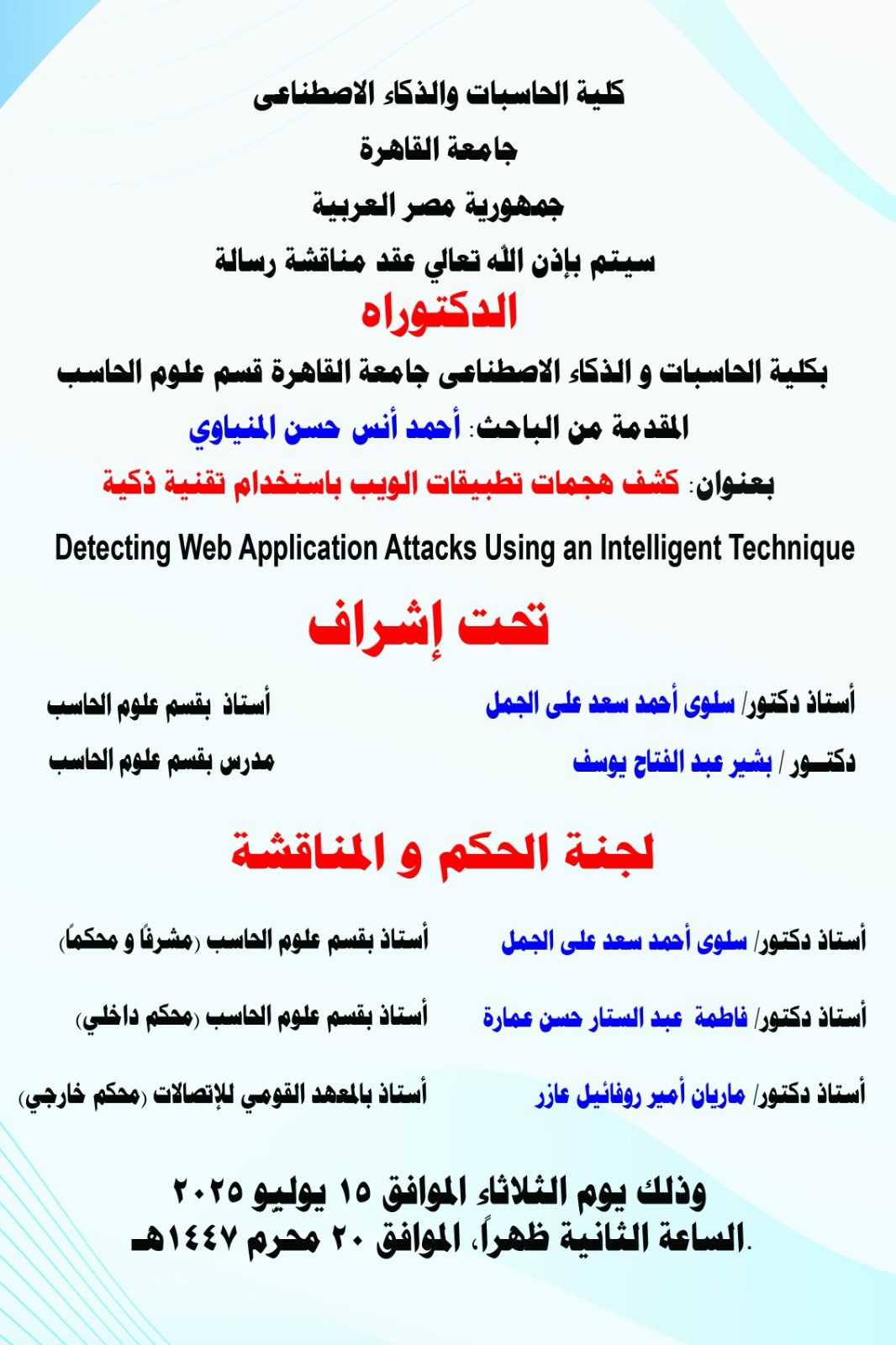 يتقدم فريق موقع ريادي بخالص التهنئة إلى الدكتور أحمد أنس المنياوي بمناسبة حصوله على درجة الدكتوراه في علوم الحاسب، تقديرًا لأبحاثه المتميزة في مجال الذكاء الاصطناعي وتطبيقاته في التصدي للهجمات السيبرانية المتقدمة.