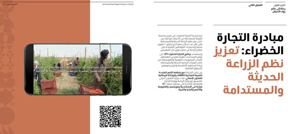 وتطرق التقرير إلى مبادرة التجارة الخضراء، والتي تمولها منظمة الأمم المتحدة للتنمية الصناعية UNIDO، والوكالة الإيطالية للتعاون الإنمائي، وتنفذها وزارة الزراعة ووزارة التجارة والصناعة بالتنسيق مع وزارة التعاون الدولي.